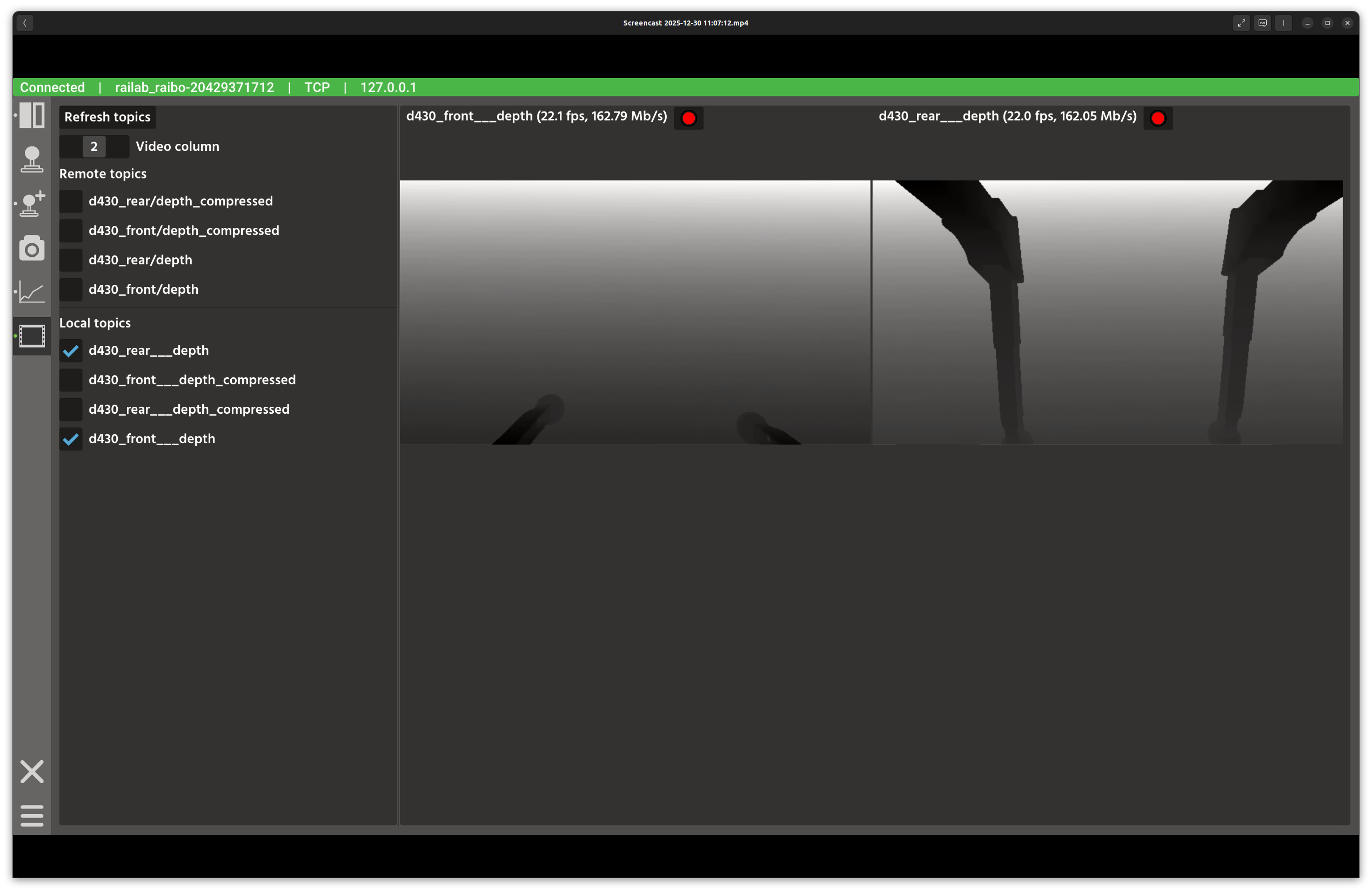 In the screenshot above, the left panel lists available video topics, while the right panel renders selected streams in a grid. A column slider controls how many streams appear per row.
