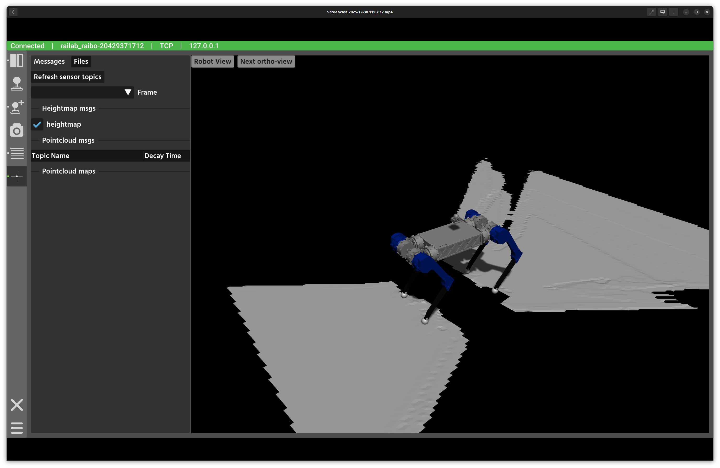 Messages tab: discover live heightmap and point cloud topics, and toggle them on or off.